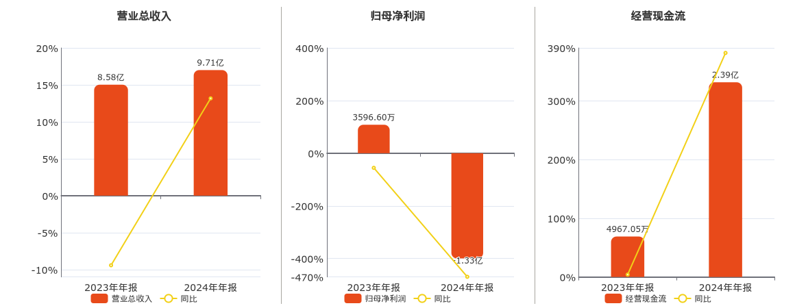 公司营业总收入为9.71亿元,在已披露的同业公司中排名第8。归母净利润为-1.33亿元,在已披露的同业公司中排名第6,较去年同报告期归母净利润减少1.69亿元,同比较去年同期下降469.37%。经营活动现金净流入为2.39亿元,在已披露的同业公司中排名第6。